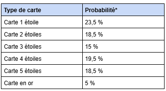 Vous recevrez une carte en or. Pour les 5 autres cartes, vous trouverez les probabilités d'obtenir chaque type de carte ci-dessous.