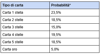 È garantito che una carta sarà una carta oro. Per le restanti 5 carte, la probabilità di ricevere un determinato tipo di carta è indicata di seguito.
