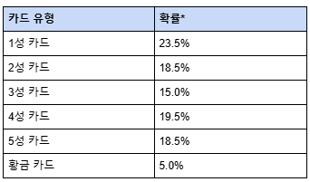 한 장의 카드는 반드시황금 카드가 돼요. 남은 5장의 카드 중 각 카드 유형을 받게 될 확률이 아래 표시돼요.