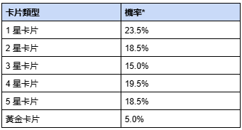 其中一張卡片保證是新卡片。 其他 5 張卡片中,每種類型卡片的獲得機率如下。